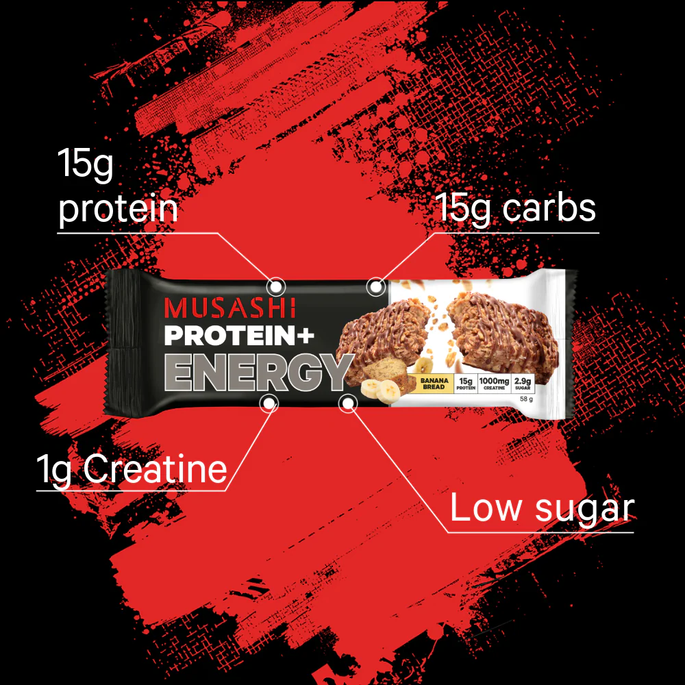 MUSASHI PROTEIN+ ENERGY BAR has been scientifically formulated with a 1:1 protein and carb blend and 1000mg of creatine monohydrate. A delicious and wholesome bar loaded with 15g of protein, it harnesses the nutritional goodness of oats to supply your body with energy before, during, or after sport or exercise.