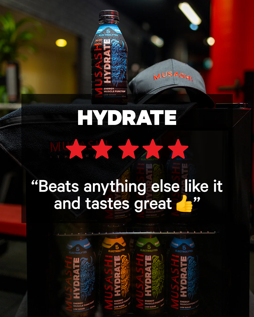 MUSASHI HYDRATE is an advanced sports fuel, that delivers fast hydration, fast energy and supports muscle function.